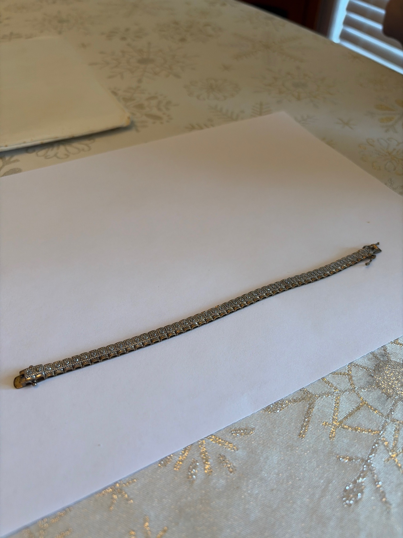 This item is a linear, articulated 'tennis style' bracelet featuring a series of rectangular or slightly curved links. The bracelet is constructed from a silver-toned metal, though significant dark gray to brownish tarnish is visible across the metal surfaces, which may indicate a sterling silver composition or a silver-plated base metal subject to oxidation. Each link is set with multiple small, colorless stones or crystals arranged in a pave or multi-row pattern. These accents appear to be glass, cubic zirconia, or low-grade diamond chips, as they display a muted sparkle in the current lighting. The piece measures approximately 7 to 7.5 inches in length, suitable for a standard adult wrist. The fastening mechanism consists of a box clasp with at least one external safety latch (figure-eight style) for additional security. Condition-wise, the item shows substantial surface oxidation and a dulling of the decorative stones, suggesting it has been stored without protection or has significant age. No specific maker's marks are legible from this distance, though such pieces are commonly mass-produced jewelry from the late 20th century, likely dating between 1980 and 2000. The craftsmanship appears consistent with mid-market costume or bridge jewelry, utilizing cast metal components and prong-set or glued-in accents.