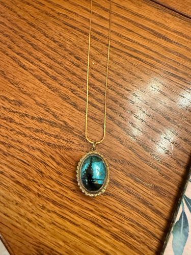 This is a vintage oval-shaped pendant necklace featuring a genuine iridescent Blue Morpho butterfly wing encased under a cabochon cover, likely glass or acrylic. The wing serves as a vibrant, shimmering blue background for a hand-painted or reverse-printed silhouette scene of a coniferous tree against a horizon. The pendant is secured in an ornate, gold-toned metal bezel with a scalloped or rope-style decorative border. It hangs from a delicate gold-toned snake chain. The iridescent quality of the wing suggests a South American origin for the biological material, a popular export for jewelry between the 1920s and 1950s (notably during the Art Deco and Mid-Century periods). The craftsmanship indicates a souvenir-grade or fashion jewelry piece, often associated with makers like Thomas L. Mott or similar firms specializing in butterfly wing art. The metal shows minor signs of age-related patina and light surface wear, but the wing remains vivid with no visible water damage or significant fading. The chain appears intact with a standard spring ring or lobster clasp (out of frame). Overall, it is a well-preserved example of naturalistic vintage jewelry.
