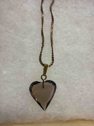 This piece of fine costume jewelry features a large, translucent smoky quartz gemstone professionally faceted into a symmetric heart shape. The crystal displays a characteristic brownish-grey 'smoky' hue with high clarity, suspended from a drill point at the upper center. The pendant is held by a simple gold-filled jump ring and a tapered bail, which connects to a delicate gold serpentine (or S-link) chain. Per the provided context, the metal components are 14/20 gold-filled, meaning 1/20th of the total weight is 14k gold bonded to a base metal core. This construction offers better durability and gold thickness than standard plating. The chain shows a bright, reflective finish typical of gold-fill, though the bail and jump ring show a slight darkening or patina consistent with age. There are no major chips visible on the gemstone facets, though subtle surface scratches may be present upon magnification. The style is representative of late 20th-century jewelry, likely from the 1970s or 1980s, emphasizing natural earth-tone gemstones and classic romantic motifs. The craftsmanship is clean, with the facets meeting at sharp points, indicating machine-cut precision intended for retail jewelry markets.