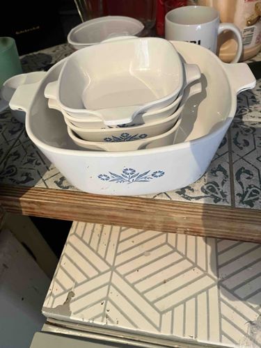 This is a collection of vintage Corning Ware oven-to-table cookware in the iconic 'Blue Cornflower' pattern, which debuted in 1958. The set includes a large square casserole dish with integrated tab handles and a stack of three smaller individual-sized ramekins or petite pan dishes. Constructed from Pyroceram, a unique glass-ceramic material developed by Corning Glass Works, these items are known for their high thermal shock resistance, allowing them to go directly from the freezer to the oven or stovetop. The dishes feature a crisp white body with the signature blue floral motif consisting of three cornflower blossoms on each side. The design suggests production likely between the 1960s and 1980s. Physically, the items show significant signs of prior use, including prominent grey metal marks (often caused by contact with metal utensils) on the exterior white surfaces, scattered dark spots, and general surface grime. No major chips or cracks are immediately visible, though the stackable nature often leads to rim flea bites over time. The glossy finish appears somewhat dulled in areas, indicating frequent washing. Identification stamps would typically be found on the underside of the handles or base, indicating capacity and country of manufacture (USA).