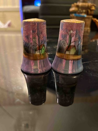 This pair of salt and pepper shakers represents classic Japanese lusterware, likely dating from the mid-20th century (c. 1940s-1950s), often associated with 'Occupied Japan' or the post-war export era. The shakers feature a cylindrical, slightly flared 'thimble' or 'cap' shape. Each piece is crafted from porcelain with an iridescent luster glaze finish that reflects light in shades of lavender, blue, and pink. The hand-painted decorative scene depicts a charming landscape with a small, green-gabled cottage nestled beside a deciduous tree with pink blossoms, set against a background of stylized vertical brushstrokes suggesting a forest or sunset sky. The top rims are accented with a hand-applied gold gilt band. The craftsmanship is typical of high-volume export porcelain from the Nagoya or Seto regions, characterized by quick, expressive brushwork and thin ceramic walls. Both pieces appear to be in good vintage condition, exhibiting no major chips or cracks, though there is minor loss to the gold gilding on the top rims and some slight surface wear consistent with age and use. While no maker's mark is visible in this orientation, these sets typically featured 'Made in Japan' stamps on the bottom cork-seal area. The iridescent finish is well-preserved, maintaining its characteristic pearlescent sheen without significant fading or crazing.