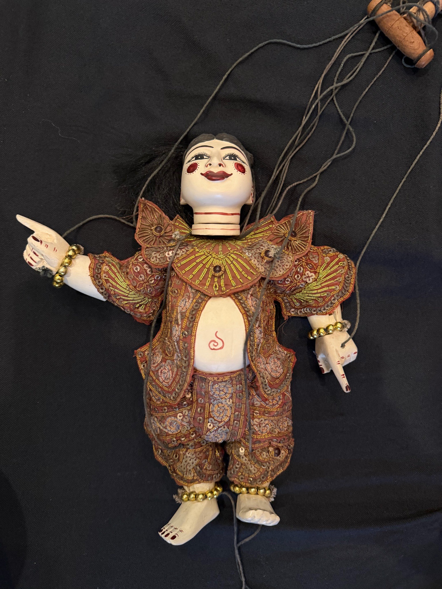 This is a hand-crafted Burmese string puppet, known as Yoke Thé, representing a human or spirit figure in traditional courtly attire. The body is constructed from carved wood, featuring an articulated neck, shoulders, and limbs. The puppet is dressed in elaborate red and gold 'shwe chi doe' (kalaga-style) embroidery, heavily adorned with hand-stitched sequins, glass beads, and metallic gold-wrapped threads. This textile work demonstrates high craftsmanship, featuring flared shoulder pads and a central scalloped collar known as a 'loun-gyi'. The face is finely painted in white with black lined eyes and red accents on the lips and cheeks, typical of the Mandalay style of puppetry. The hands are carved into expressive gestures with gold-beaded bracelets at the wrists. The strings are attached to a traditional wooden cross-handle (hka-pauy), though they appear slightly tangled. Notably, there is a red spiral-shaped navel mark painted on the midsection. The condition shows light patina on the wood and some minor fraying of the textile edges, suggesting it is a late 20th-century piece intended for performance or high-quality souvenir trade. The black hair is likely synthetic or horsehair, and there are no visible maker's marks, which is common for these traditional folk-art items.