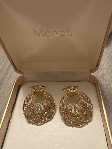 A pair of sophisticated vintage 'doorknocker' style earrings by Monet, presented in their original branded exhibition box. These earrings feature a highly detailed panther or large cat head at the top, acting as the stud or post mechanism. Suspended from the feline's mouth is a large, ornate circular hoop with an intricate openwork filigree design. The earrings are constructed from a yellow gold-toned metal, characteristic of Monet's high-quality triple-plated gold technique which provides a rich, lasting finish. The filigree section is further embellished with small, round-cut rhinestones in shades of pink and iridescent aurora borealis, adding a subtle sparkle and texture to the piece. The overall craftsmanship reflects the high standards of Monet jewelry from the mid-to-late 20th century, likely dating to the 1980s or 1990s during the height of the bold costume jewelry trend. The condition appears to be excellent with no visible metal oxidation or missing stones, and the original box provides significant provenance and preservation value. The Monet signature is clearly embossed on the interior lining of the flip-top jewelry box, suggesting these have been well-maintained as a set.