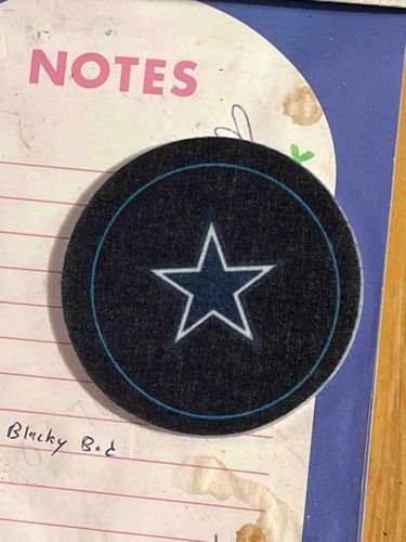 This item is a circular embroidered or fabric-transfer patch featuring the iconic lone star logo of the Dallas Cowboys NFL franchise. The patch has a dark navy blue, almost charcoal black background with a textured, felt-like or heavy canvas surface. Centered in the middle is a five-pointed star consisting of a dark blue interior, a thick white border, and a thin outer blue outline. A thin light blue concentric ring borders the inner area of the circle. The overall diameter appears to be approximately 2.5 to 3 inches based on its scale relative to the notebook paper beneath it. This specific design variation utilizes a darker aesthetic compared to the traditional bright navy blue and silver. The patch appears to be in used condition; the fabric surface shows slight pilling and lint accumulation, particularly on the matte dark areas. There is soft edge wear visible where the die-cut circle meets the backing. No specific maker's marks or iron-on adhesive backing details are visible from this angle, but the construction suggests a modern mass-produced fan accessory likely from the late 20th to early 21st century. The craftsmanship is consistent with standard sports merchandise licensing quality.
