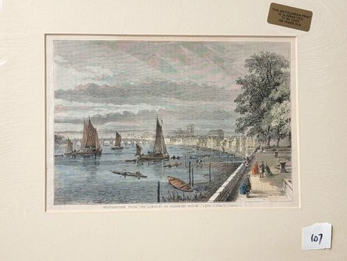 This item is an antique hand-colored steel or copper plate engraving titled 'Westminster, From the Gardens of Somerset House,' likely based on an original plate by Canaletto. The landscape orientation print depicts a scenic view of the River Thames in London during the mid-18th century, featuring various sailing vessels, rowboats, and the architectural skyline of Westminster in the distance. The print is executed on paper and showcases delicate hand-tinting in muted tones of blue, pink, and green. A prominent matting surrounds the artwork, which includes a gold sticker in the upper right corner stating 'THIS ANTIQUARIAN PRINT IS GUARANTEED TO BE OVER 100 YEARS OLD,' suggesting a production date in the 19th century or earlier. The bottom margin contains the title text and a reference to the original artist. Notable condition details include slight yellowing of the paper consistent with age and possible minor foxing. The engraving exhibits fine cross-hatching and line work, characteristic of high-quality period printmaking. The presence of a small white sticker with the number '107' at the bottom right indicates it was likely part of an auction or gallery inventory.