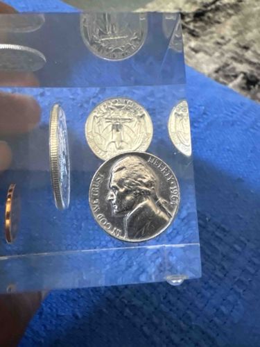 This item is a vintage rectangular paperweight constructed from clear, polished Lucite (synthetic acrylic resin). Suspended within the transparent medium are several 1964-dated United States circulating coins, including a clearly visible Jefferson Nickel. The nickel shows Thomas Jefferson on the obverse with the motto 'IN GOD WE TRUST' and the date '1964'. Adjacent to it, a Washington Quarter is visible from the reverse side, showing the heraldic eagle. The coins appear to be in Uncirculated (BU) or high-grade condition, exhibiting original mint luster that has been preserved by the airtight resin encapsulation. The paperweight is a solid block with sharp geometric edges, typical of mid-20th-century desk accessories. Notable features include the varying orientations of the coins, creating a three-dimensional floating effect. The Lucite shows minor surface abrasions and light scratches consistent with age and previous use as a desk ornament, but overall transparency remains high with no significant yellowing or internal fracturing. This style of 'coin-in-plastic' novelty was highly popular in the 1960s and 1970s, often produced by companies like Kanroe or various souvenir manufacturers. The 1964 date is significant as it represents the final year of silver content for many U.S. denominations, although nickels of this year are composed of copper-nickel.