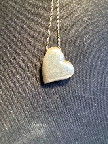 This item is a modern heart-shaped pendant necklace crafted from what appears to be polished sterling silver or a similar white metal alloy. The pendant features a three-dimensional, 'puffed' or 'full-heart' design with smooth, rounded contours and a soft sheen. It is suspended from a delicate cable link chain that passes through a hidden or integrated bale at the top of the heart. The surface shows a slightly matte finish, potentially due to fine surface scratches or a brushed texture, indicating frequent wear. There is a visible horizontal line or fissure across the lower left quadrant of the heart, which could suggest a manufacturing seam or a structural flaw in the metal shell. No clear hallmark or maker's mark is visible in the provided image, but the design style is reminiscent of late 20th-century minimalist jewelry, specifically echoing the aesthetic of Elsa Peretti for Tiffany & Co. The condition shows light patina and surface abrasions consistent with a vintage or well-loved piece of fine jewelry.
