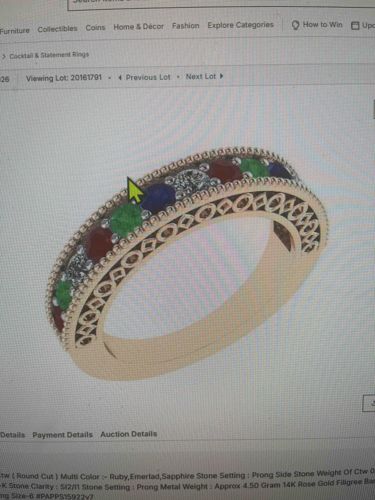This is a contemporary multi-gemstone band, likely cast in 14K rose gold based on the visible metadata and warm pinkish metallic hue. The ring features a channel-style arrangement of round-cut stones including red rubies, green emeralds, blue sapphires, and clear accent stones (possibly diamonds). The band is characterized by extensive decorative work, featuring milgrain edges bordering the gemstone row and a complex openwork filigree/filigree-style pattern on the side galleries consisting of repeating geometric or quatrefoil-like shapes. The construction appears to be a modern piece designed with vintage aesthetic influences. The image is a digital render or a high-quality catalog photo from an online auction platform, showing the item in pristine, unworn condition with no visible scratches, patina, or gemstone damage. The metal weight is specified as approximately 4.50 grams, indicating a substantial build quality. The craftsmanship showcases precise stone setting and symmetrical piercing in the gallery. While inspired by Edwardian or Art Deco filigree, the clean lines and specific manufacturing notes suggest this is a modern commercial production piece, likely sized as a 6.