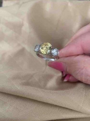 This is a classic three-stone 'past, present, future' style ring featuring a large center stone and two slightly smaller flanking side stones. The center stone is a faceted oval or modified cushion cut presenting a soft canary yellow hue, while the side stones are clear, brilliant-cut faceted stones. The metal setting appears to be a high-gloss silver-toned material, likely sterling silver, white gold, or platinum, though no specific hallmark is visible in the provided image. The stones are secured in multi-prong basket settings. Specifically, the center yellow stone is held by four visible prongs. The band is a slender, polished shank that tapers slightly toward the settings. In terms of condition, the metal shows minor surface micro-scratches consistent with light wear. The stones appear relatively clean with no major visible chips or fractures, though there is a Slight dullness captured in the light that may suggest they are high-quality costume or laboratory-created stones rather than naturally mined diamonds or sapphires. The overall craftsmanship displays symmetry and traditional jewelry-making techniques common in contemporary or late 20th-century celebratory jewelry. The color contrast between the yellow and white stones is the primary design feature, intended to emulate more expensive 'Fancy' colored yellow diamonds. Total estimated size suggests a center stone of approximately 2-3 carats with side stones of roughly 0.5-0.75 carats each.
