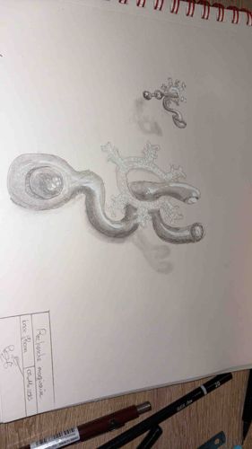 This item is an original conceptual pencil drawing executed in a spiral-bound sketchbook. The composition features two abstract, biomorphic forms characterized by fluid, tube-like appendages and organic, bulbous shapes. The central figure is rendered with significant tonal shading to create a three-dimensional effect, entwined with a jagged, circular element reminiscent of a gear or a crown. A smaller, similar study appears above the main figure. The drawing is executed on white paper using graphite, showing varying degrees of hardness for light outlines and deep shadows. In the lower left corner, a handwritten identification box is visible, featuring French text: 'Recherche imaginaire', the date '05/11/2015', and an artist's signature. The overall style is contemporary and surreal, focusing on movement and depth. The paper appears to be in good condition with no visible foxing, though it remains attached to the sketchbook binding. The craftsmanship shows professional control over light and shadow to define volume despite the abstract subject matter. A mechanical pencil and a fineliner pen are visible in the foreground, indicating the artist's tools.