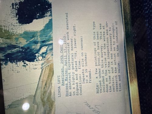 This is an original fine art oil painting on canvas by American artist Linda Levi, titled 'Horses Mains' and dated April 17, 1959. The piece is a quintessential example of mid-20th-century Abstract Expressionism, characterized by a highly gestural and energetic Application technique. The medium is specifically identified as impasto oils, which is visible in the physical texture of the paint, showing heavy, thick applications that create three-dimensional depth on the canvas surface. The color palette features a sophisticated blend of deep navy blue, teal, sage green, and earthy ochre or tan tones set against a neutral, light-colored background. Measuring 30 x 39 inches, the large-scale work is housed in a simple metallic-toned frame that complements the modern aesthetic. According to the attached documentation, the work is signed and dated '58 in the lower right, though the title page notes the specific completion date in 1959. The condition is professionally described as 'fine,' with no immediate visible signs of cracking, flaking, or damage to the impasto layers. The craftsmanship is high-quality, reflecting the spontaneous and emotive style of the New York School influence during this period. The provenance is bolstered by the attached typed appraisal or survey note, which highlights the artist's emerging recognition at the time of the document's creation.