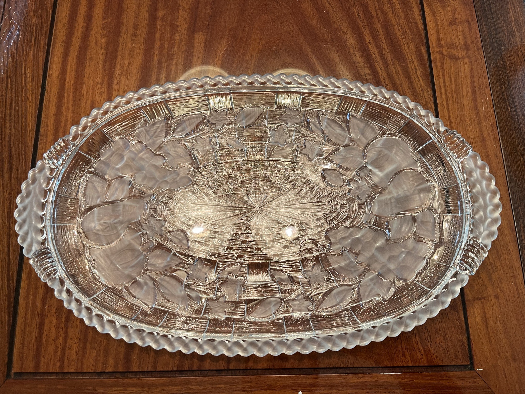 This is a substantial, oval-shaped pressed glass serving platter measuring 12 1/2 inches in length by 8 1/2 inches in width. The piece features a complex, multi-textured design combining clear and frosted glass elements. The primary motif consists of a frosted intaglio fruit and foliage border, including textures resembling grapes, pears, and leaves, which surrounds a central starburst or sunburst pattern. This central medallion is framed by a clear basketweave texture that provides a structural visual contrast to the organic fruit forms. The outer rim is finished with a distinctive frosted, beaded rope or scalloped edge that adds a tactile elegance and hides potential chipping. The glass appears thick and heavy, typical of mid-20th-century American or European glassware production (circa 1960s-1980s). The condition appears excellent with good clarity, no visible cracks or major chips, and minimal surface scratching, though the frosted sections may show light handling patina. The craftsmanship is indicative of high-quality mass-produced glass intended for formal dining use, often seen in manufacturers like Mikasa or Indiana Glass, though no specific maker's mark is visible in this orientation.
