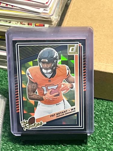 This is a 2024 Donruss football trading card featuring wide receiver Pat Bryant of the Denver Broncos from 'The Rookies' insert set. The card is standard sized (2.5 by 3.5 inches) and is constructed from premium glossy cardstock with a distinctive black border and orange accents matching the team's colors. The design utilizes a checkered green and black holographic pattern in the background behind the action shot of the player in a home orange jersey. The 'Donruss' brand logo is visible in the upper right, and the 'The Rookies' stylized logo appears in the bottom left. The player's name and team information are printed on a diagonal orange and white banner across the bottom right quadrant. Condition-wise, the card is currently housed in a rigid plastic top-loader for protection. The corners appear sharp through the plastic with no obvious surface abrasions, though centring across the white inner border seems slightly shifted toward the bottom left. The surface finish is reflective consistent with 'optichrome' or high-gloss finish inserts. This item represents a modern collectible from the early 2024 release cycle, targeted at NFL enthusiasts and rookie card collectors.