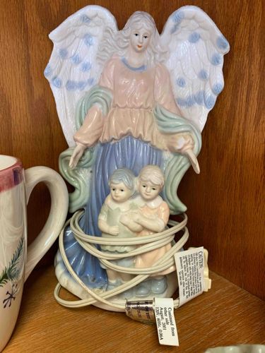 This item is a decorative porcelain night light featuring a guardian angel watching over two children. The figurine is constructed from slip-cast ceramic with a semi-matte or satin glaze finish. The color palette consists of soft pastel tones, including a peach-colored bodice, a long flowing blue skirt, and light green draped accents. The angel’s wings are white with blue scalloped feather details. Two small children, a boy and a girl, stand in the foreground, embraced and dressed in coordinating pastel green and peach attire. The piece includes a white electrical cord wrapped around the base and a bulb housing internally to illuminate the porcelain from within, a technique often called lithophany or translucent porcelain. Notable details include fine facial features and flowing hair textures. The attached electrical safety tag is dated August 2001, suggesting a late 20th to early 21st-century manufacturing period. The condition appears fair, with the glaze intact and no visible chips or cracks from the frontal view, though the electrical cord shows signs of use and being coiled tightly. This style is consistent with mass-produced religious giftware from companies like Enesco or Lefton, though no specific maker's mark is visible on the front.