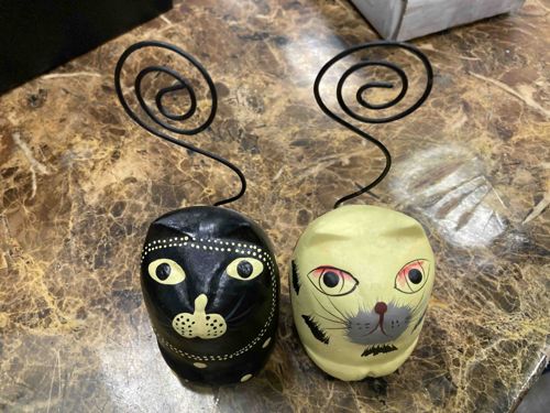 This is a whimsical pair of decorative photo or place card holders, featuring egg-shaped feline forms. The objects are likely hand-carved from a lightweight wood or molded from a composite material, coated in a matte finish. One cat is decorated in a black lacquer style with cream-colored dot work outlining the face and back, featuring stylized wide eyes and a dotted muzzle. The second cat is a pale yellow or cream color with grey-painted whiskers and reddish accents around the eyes, suggesting a folk-art aesthetic. Both figures feature a black wire spiral 'tail' that extends upward to serve as a clip for holding photographs or cards. The construction is modest, with the wires inserted directly into the top of the rounded bodies. The paintwork displays minor variations and slight imperfections characteristic of hand-produced items. Condition appears good overall, with some very minor surface scuffing and dust accumulation visible on the black finish. There are no obvious chips or structural repairs. They likely date from the late 20th century to early 21st century and evoke a rustic, handcrafted charm often found in boutique giftware or artisanal craft markets.
