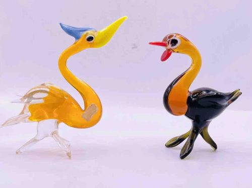 This pair of stylized avian figurines displays the hallmark characteristics of lampworked or hand-blown glass artistry, reminiscent of Mid-Century Modern Italian glass from the Murano tradition. The first figure is a translucent yellow and clear glass crane-like bird with an elongated S-curve neck, a blue crest, and a yellow beak directed upward. The second figure is a more stout, duck or goose-like creature featuring a vibrant orange-yellow neck, a black body with iridescent sheen, and a red beak. Both pieces utilize thin glass rod construction for the legs and delicate anatomical features, such as the applied glass for eyes and beaks. The craftsmanship involves internal layering of colors known as 'sommerso' or cased glass techniques to create depth within the bodies. While no specific maker's marks are visible in the image, the whimsical, expressive forms suggest late 20th-century production. The condition appears fair to good; however, a surface-level adhesive residue or sticker mark is visible on the yellow bird's neck, and the delicate nature of the thin glass legs suggests potential micro-fractures common in these types of ornaments. The flowing, organic lines and high-gloss finish indicate high-quality artistic glasswork intended for decorative use.