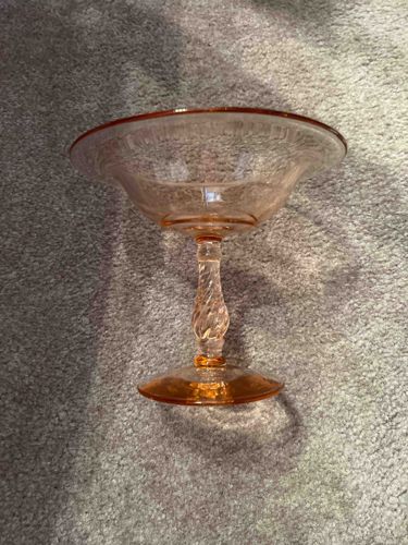 This item is a vintage pink depression glass compote, likely dating between the 1920s and 1930s. The piece features a shallow, flared bowl with a subtly scalloped or rolled rim and a decorative optic pattern that catches the light. One of its most distinguishing features is the twisted or 'spiral' stem (often referred to as a rope twist), which connects the bowl to a circular, flat pedestal base. The color is a delicate translucent salmon-pink, characteristic of many glass manufacturers of that era like Fostoria, Tiffin, or Cambridge. The construction is molded or pressed glass, though the clarity and thinness suggest a piece of higher quality. Physically, the item appears to be in good vintage condition with no major chips or cracks visible in the provided image. There is a slight amber-like warmth to the base, which may be due to the lighting or the specific chemical composition of the glass batch. Pieces like this were mass-produced but are now highly collectible for their elegant Art Deco silhouettes and historical significance in American domestic glassware. The craftsmanship is evident in the uniform distribution of color and the intricate detail of the twisted stem.