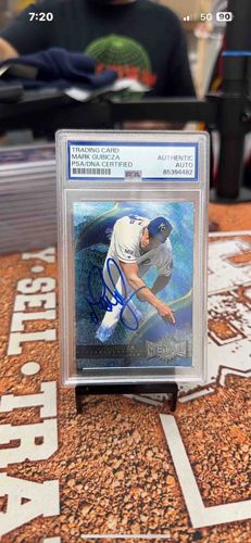 This item is a professionally graded and authenticated trading card featuring Mark Gubicza, a former professional baseball pitcher, with his autograph. The card is encased in a rigid, transparent plastic slab, typical for PSA (Professional Sports Authenticator) grading, which protects its integrity and displays the certification label prominently at the top. The label indicates 'TRADING CARD', the player's name 'MARK GUBICZA', and 'PSA/DNA CERTIFIED' for the autograph. It also clearly states 'AUTHENTIC AUTO' and bears the PSA certification number '85394482'. The trading card itself appears to be from a 'Metal Universe' series, as indicated by the 'METAL '99 UNIVERSE' logo visible at the bottom right. The card's design features Gubicza in a pitching motion, wearing a Kansas City Royals uniform, against a dynamic, almost iridescent blue and green background, suggesting a holographic or foil finish. His signature in blue ink is prominently placed over his body on the front of the card. The card appears to be in excellent condition, protected by the slab, with no visible wear, tears, or creasing on the card itself. The slab is clean and clear, showing no significant scratching or damage. This item represents a collectible from the late 1990s, likely 1999 given the '99' on the 'Metal Universe' logo. The professional grading and authentication by PSA/DNA add significant value and assurance to the autograph's authenticity. The unique metallic finish and artistic design are characteristic of trading cards from this era, aiming for a premium aesthetic.