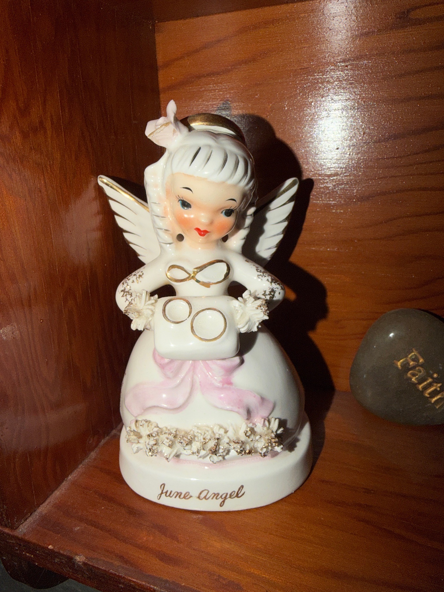 This is a vintage mid-century ceramic angel figurine from the National Potteries Corporation (Napco) monthly birthday series, specifically representing June. The figurine is crafted from glazed white earthenware and stands approximately 4.5 inches tall. It features a young angel with a sweet, hand-painted 'pixie' face, characterized by long eyelashes, blue eyes, and red lips. She wears a white dress accented with spaghetti-fringe trim at the sleeves and hemline, which is highlighted with gold sponge-painting. To represent June, she holds a white pillow featuring two gold circles (representing wedding bands/rings), symbolizing weddings frequent in that month. A large pink bow is tied at her waist. The figurine includes classic 1950s elements such as a gold-tone halo and gold-tipped wings. The base is clearly inscribed with 'June Angel' in gold script. The construction is indicative of Japanese imports from the 1950s or 60s, known for delicate details and high-gloss glazes. Overall condition appears excellent with minimal crazing and no visible chips or cracks. The gold gilding remains bright with very little rubbing, suggesting it has been well-preserved as a collectible.
