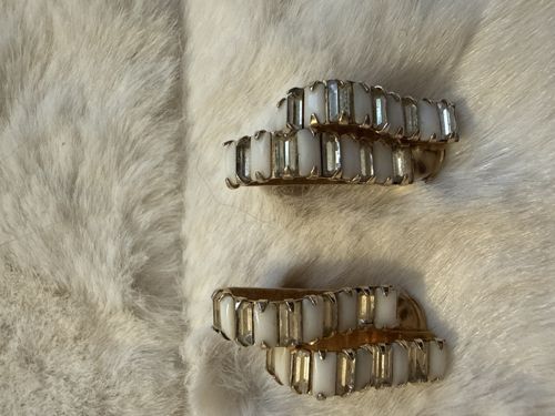 This pair of vintage clip-on earrings features a sophisticated 'chute' or double-scroll design, characteristic of high-end costume jewelry from the 1950s or 1960s. The earrings are constructed with a gold-tone metal base, utilizing a prong-set arrangement to secure a repeating pattern of alternating stones. The sequence consists of opaque white milk glass (opal glass) cabochons in a rectangular baguette cut, juxtaposed with clear, high-clarity baguette-cut crystals. The mention of UV reactivity in the clear stones suggests they may be high-lead glass or a specific synthetic stimulant of the era, while the lack of fogging points to surface hardness consistent with quality stones or glass. The craftsmanship is evident in the individual prongs for each stone and the fluid, overlapping curves of the metalwork. Condition-wise, the gold plating shows a warm, aged patina with minor surface scratches and slight oxidation typical of vintage pieces. The milk glass appears intact with no visible flea bites, and the clear stones retain their brilliance. The lack of a maker's mark suggests they may be from a boutique manufacturer or part of a set where only the necklace was signed, though the style is highly reminiscent of designers like Kramer or Trifari.