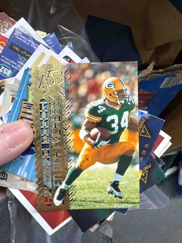 This item is a 1996 Topps Laser football card featuring Green Bay Packers running back Edgar Bennett wearing jersey number 34. The card is a standard 2.5 by 3.5 inch trading card but features a complex, intricate laser-cut design on the left side, which was a signature characteristic of the Topps Laser high-end set from the mid-1990s. The laser-cut section is finished in a metallic gold foil and displays the team name 'Green Bay Packers' and the 'Topps Laser' brand logo vertically. The right half of the card features a high-gloss color action photograph of Bennett carrying the football in the classic Packers green and gold uniform. This specific set was known for its 'Open-Work' technology, creating a delicate fretwork pattern that is prone to bending or snagging. The condition of this specific example shows noticeable wear; the corners appear softened, and the intricate laser-cut edges exhibit slight fraying and cardstock separation. The card is currently being held by hand in a stack of mixed 1990s-era cards (including Pinnacle brands), indicating it has been stored loosely rather than in protective sleeves, which impacts the overall surface grade and value. Manufacturing details include the 1996 Topps copyright, and it represents the high-tech, experimental premium card era of the 1990s.