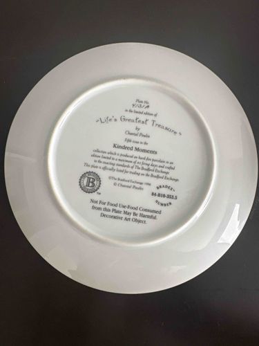 This is a decorative collector plate made of hard-fired white porcelain, specifically the fifth issue in the 'Kindred Moments' series titled 'Life's Greatest Treasure.' The artwork is credited to Chantal Poulin. The reverse side features extensive black transfer-printed information, including the plate number (hand-inscribed as 4131A) and the Bradex Number 84-B10-353.5. Manufactured in 1996 for The Bradford Exchange, the plate is designed strictly for decorative purposes, as indicated by the bold 'Not For Food Use' warning on the back. Physically, the plate is circular with a smooth, glazed finish and a defined foot ring. The porcelain appears to be in excellent condition with no visible chips, cracks, or crazing. The firing period for this specific edition was strictly limited to a maximum of 95 firing days. The craftsmanship reflects typical late 20th-century mass-market collectivity standards, featuring high-quality ceramic firing and clear, legible typography. Its value lies primarily in its status as a vintage collectible from a known series rather than for utilitarian use.