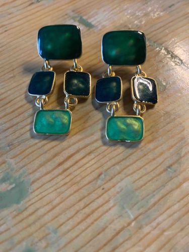 A pair of gold-toned dangle earrings featuring a geometric multi-tiered design. Each earring is composed of four rectangular panels linked by small metal rings, creating a kinetic drop effect. The top post is a deep forest green, followed by two smaller side-by-side squares in navy or dark teal blue, and terminating in a single mint green rectangular base. The panels are filled with a glossy, translucent enamel that exhibits a subtle pearlescent or mottled texture, common in late 20th-century costume jewelry. The metal appears to be a plated base metal with a matte or satin gold finish. Based on the construction and aesthetic, these are likely 1980s or 1990s vintage fashion accessories. The condition appears fair with visible signs of aging: the bottom right panel of the right earring shows significant crazing or surface abrasion in the enamel coating. The metal rings show minor surface patina and light wear consistent with regular use. There are no visible maker's marks or hallmarks visible from the front view, suggesting these are high-quality mass-market or boutique production pieces rather than fine jewelry. Overall, the color palette and structured silhouette are characteristic of the bold jewelry trends of the Reagan era.