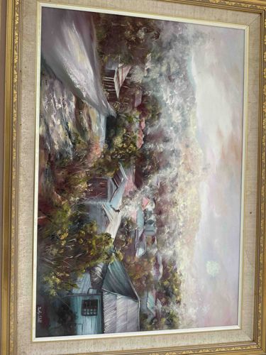 This is an original impressionist oil painting on canvas by the artist Kathy Shell, depicting a hillside village or shanty settlement nestled among dense foliage. The composition utilizes a vertical orientation with a palette dominated by muted pinks, ochres, greens, and grays. The application of paint is thick and gestural, showing visible brushwork and impasto techniques that provide a sense of movement and texture throughout the landscape. The structures feature peaked roofs with distinct line work suggesting corrugated metal or wood siding. In the lower left corner, a clear signature reads 'Kathy Shell'. The artwork is housed in a contemporary decorative wooden frame with a gold-leaf finish and an inner linen-textured matting. The frame displays classic beaded and scrollwork patterns popular in the late 20th century. The condition appears well-preserved with no immediate signs of canvas sagging, paint loss, or heavy cracking, though the linen liner suggests some age-appropriate yellowing. The style is indicative of the late 1970s to 1980s Australian impressionism, which often focused on rural and mining settlements with an atmospheric, hazy quality. The craftsmanship reflects a professional hand, particularly in the handling of light and the atmospheric perspective in the upper background.