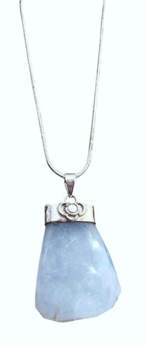 This jewelry piece consists of a substantial freeform tumbled blue chalcedony stone, suspended as a pendant. The chalcedony displays a soft, translucent pale lavender-blue hue with natural internal cloudy inclusions and subtle veining characteristic of high-quality quartz-based minerals. The stone is roughly trapezoidal in its raw, polished form, measuring approximately 1.5 to 2 inches in length. It is secured by a custom-fitted sterling silver cap at the top, which features a decorative floral or quatrefoil-style emblem centered on the front face. The silver shows a polished finish with minor surface micro-scratching indicative of light previous wear. The pendant is hung on a sterling silver 'snake' style chain, known for its smooth, tubular link construction that provides a fluid drape. The silver craftsmanship appears to be mid-level contemporary artisan work, likely dating from the late 20th century to the early 2000s. There are no visible chips or major fractures in the stone, though the natural irregular surface suggests an organic aesthetic. The bail is integrated into the cap, allowing for free movement on the chain.