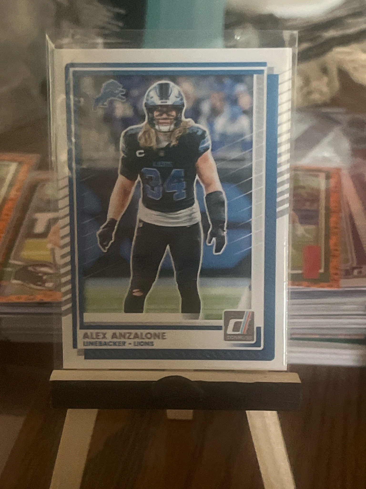 This is a standard 2.5 by 3.5-inch modern sports trading card from the 2023 Panini Donruss football collection. The card features Alex Anzalone, linebacker for the Detroit Lions, depicted in a full-body action pose wearing the team's dark blue home jersey with the number 34. The card design is characterized by the classic Donruss 'Rated Rookie' style aesthetic, although this specific card is part of the veteran base set. It features a white outer border with a layered blue inner frame that includes the Detroit Lions logo in the upper left corner and the iconic Donruss 'D' logo in the lower right corner. The player's name and position are clearly printed in the lower-left caption area. The card is protected by a clear plastic penny sleeve and displayed on a miniature wooden easel. Regarding condition, the card appears to be in 'Near Mint' to 'Mint' state with sharp corners, clean edges, and no visible surface scratches or creases through the protective sleeve. The centering appears slightly heavy toward the right margin. This card represents a mass-produced modern collectible made of semi-glossy cardstock with high-resolution offset printing.