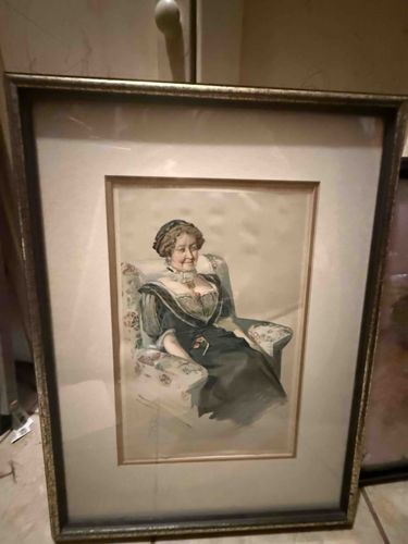 A quietly dignified vintage portrait of a seated woman dressed in dark formal attire, softened by the delicate lace collar framing her face. She rests in a floral armchair, her posture composed and serene, evoking the grace and restraint of an earlier era. The artist’s hand is evident in the subtle modeling of the fabric and the warm, muted palette that gives the piece its timeless presence. Housed in a textured metallic frame with a classic beige mat, this original painting carries the intimate charm of a family heirloom. A period newspaper clipping affixed to the back adds a layer of historical intrigue, suggesting a story preserved across generations.