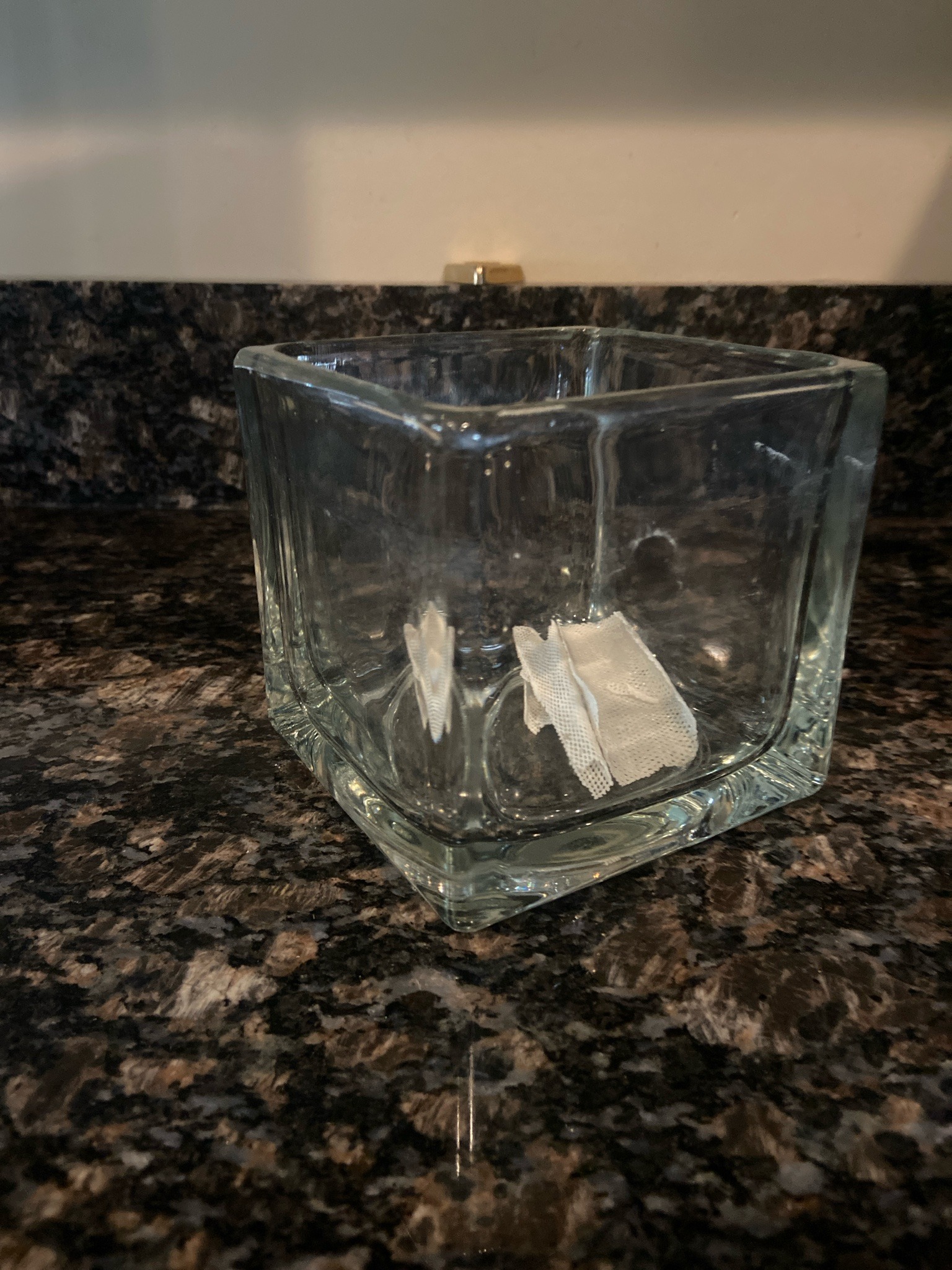 This item is a contemporary square-shaped glass vase, often categorized as a cube vase or floral container. It is constructed from thick, clear soda-lime glass with a heavy, weighted base that provides stability for floral arrangements or decorative displays. The item features four vertical sides of equal dimensions, meeting at slightly rounded corners that soften the geometric silhouette. The glass thickness appears to be approximately 3/16 to 1/4 inch, indicating mass-production quality common in modern hospitality or wedding industry glassware. The interior depth is nearly equal to its external width, creating a balanced cube proportion. Visible on the interior surface are white mesh-like fabric remnants or adhesive residue, possibly left behind from a previous decorative application or packaging material. The glass exhibits minor surface smudging and water spots, but no visible chips, cracks, or deep abrasions are apparent. The rim is fire-polished to a smooth finish. There are no prominent maker's marks or signatures visible from this angle, suggesting a commercial-grade manufacturer likely from the late 20th or early 21st century. The clarity of the glass is standard for commercial grade, showing typical slight greenish or bluish tints at the thickest joints when viewed under specific lighting.