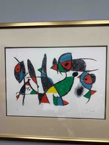 This is a rectangular horizontal lithograph by the celebrated Spanish Surrealist artist Joan Miró (1893–1983). The composition features his trademark biomorphic abstractions and glyph-like forms, characterized by heavy black gestural outlines filled with a vibrant primary palette of red, blue, green, and yellow against a clean white ground. The piece displays Miró's playful and spontaneous style, often associated with his late-period Surrealist works from the mid-20th century. Notably, the artwork includes a visible pencil signature by the artist in the lower right margin and a numerical edition marking (likely 'HC' or a specific number) in the lower left, indicating its status as a limited edition print rather than a mass reproduction. The work is professionally housed in a gold-toned metallic frame with a double mat in cream and gold, which complements the art while providing conservation protection. The medium appears to be lithography on high-quality woven paper, exhibiting the grainy texture typical of the lithographic stone process. The condition appears excellent with no visible foxing, yellowing, or paper waviness, suggesting it has been kept in a climate-controlled environment away from direct UV exposure. The framing is contemporary and secure, though the paper's full margins are obscured by the matting.