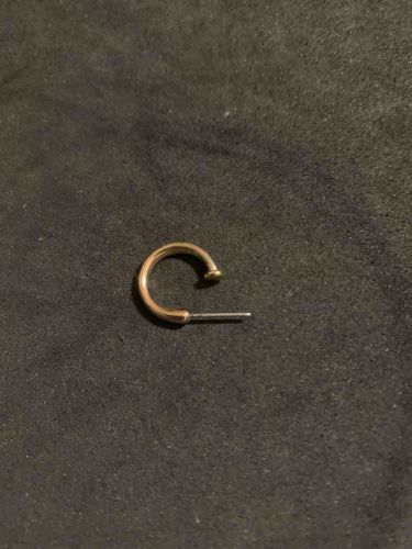 This item is a single, small C-shaped hoop earring designed for a pierced ear. The main body of the earring features a rounded, tubular construction with a polished gold-toned finish. One end of the crescent is terminated with a decorative, flat-topped bulbous finial, while the other end transitions into a straight metal post. The post appears to be made of a different material, likely surgical steel or sterling silver, given its distinct silver-colored metallic hue compared to the gold-toned hoop. The earring measures approximately 10mm to 12mm in diameter, suggesting a 'huggie' style or a close-fitting lobe piercing. In terms of condition, the piece shows moderate signs of wear including surface micro-scratches and areas of tarnish or plating loss near the junction of the post and the hoop. The gold finish lacks the deep luster of high-karat solid gold, suggesting it is likely gold-plated brass or a costume jewelry alloy. There are no visible maker's marks or hallmarks on the interior or the post, pointing toward contemporary mass-market production rather than artisanal craftsmanship. The style is a minimalist aesthetic consistent with modern jewelry design from the early 21st century. The earring is missing its butterfly or friction back closure.