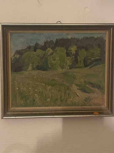 This item is an original oil painting on a small-scale board or panel, depicting a lush rural landscape. The composition features an open meadow in the foreground leading toward a dense line of trees and a shadowed forest under a muted blue sky. The palette is dominated by earthy greens, browns, and ochre, suggesting a mid-to-late 20th-century impressionistic style with visible, thick brushwork and impasto techniques. The physical construction is relatively small, approximately 8x10 or 9x12 inches, housed in a traditional silver-toned wooden or composite cove frame with a thin gold-toned inner liner or sight edge. There is a visible orange sticker on the lower right corner of the frame, likely a previous auction or estate sale cataloging tag. Notable features include the atmospheric rendering of the forest and the use of light to define the rolling terrain. Condition-wise, the frame shows light surface scuffing and minor gapping at the mitered corners, consistent with age. The painting surface appears stable with some minor surface grime and a naturally aged varnish; no significant paint loss or cracking is visible from the frontal view. While no signature is immediately discernible on the face of the painting, the execution suggests a proficient amateur or regional professional artist. The overall craftsmanship reflects a classical plein-air approach, focusing on light and natural textures rather than fine detail.