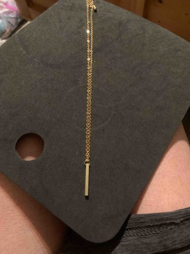 This jewelry piece consists of a minimalist vertical pendant suspended from a fine cable-link chain. The pendant is a solid rectangular prism, commonly referred to as a 'bar' style, featuring a polished yellow gold-tone finish. It is attached to the chain via a small circular jump ring at the top. The chain itself is delicate, with uniform oval links that create a consistent shimmer. At the top of the chain, there is a small extender section with a decorative bead or drop, allowing for adjustable length. The metallic surfaces appear smooth and well-polished, reflecting light with a high luster typical of plated fashion jewelry. While specific hallmarks are not visible in the provided image, items of this style often utilize brass or stainless steel as a base metal with a thin gold plating. The condition appears to be excellent with no visible tarnishing or scratches on the bar surface. This aesthetic is characteristic of contemporary 'minimalist' fashion trends from the mid-2010s to the present. The craftsmanship shows clean lines and precise geometry on the bar, indicating a mass-production or high-quality commercial manufacturing process.