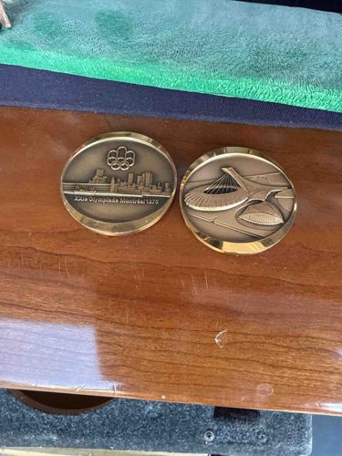A pair of official bronze participation medals from the XXI Olympiad held in Montreal, 1976. Each medal measures approximately 45mm in diameter and is struck in a bronze alloy with a patinated, matte-finish relief and polished rims. One medal displays the obverse side featuring the Montreal 1976 Olympics logo (a stylized 'M' for Montreal and five rings) positioned above a highly detailed cityscape of Montreal and the text 'XXIe Olympiade Montréal 1976'. The second medal shows the reverse side, which depicts a high-relief architectural rendering of the Olympic Stadium, the Olympic Pool, and the Velodrome, capturing the modernist architectural aesthetic of the era. The medals exhibit high-quality relief striking with sharp, crisp lines in the lettering and architectural details. The condition appears very fine to nearly uncirculated, displaying a rich, even brown patina with minimal signs of surface wear or oxidation. There are no visible deep scratches or significant edge dents. These particular medals were commissioned by the COJO (Comité organisateur des Jeux olympiques) and designed by artist Georges Huel. They served as commemorative tokens for athletes, officials, and volunteers, representing a significant piece of Olympic and Canadian history.