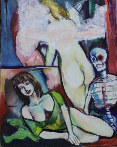 This original work of art is a figurative composition executed in an Expressionist style, likely oil or acrylic on canvas. The painting features a complex, multi-layered vertical arrangement. In the lower foreground, a woman with dark hair and a green garment is depicted in a reclining pose, executed with bold, black outlines and a vibrant palette of greens and blues. Adjacent to her sits a skeletal figure, a classic 'memento mori' or vanitas motif, rendered in white and blue tones with anatomical details emphasized by dark linework. The upper portion of the canvas depicts two nude figures in an embrace; these figures are significantly obscured by a white, gauzy impasto or overpainting, creating a ghostly, dreamlike quality. The overall color scheme is dramatic, utilizing deep reds, cerulean blues, and earthy ochres against stark highlights. The brushwork is vigorous and gestural, showing visible impasto and layering techniques. No artist signature or date is immediately visible on the front of the work. The condition appears stable, though there is some light scalloping along the edges, and the intentional overpainting on the upper figures serves as a significant stylistic element. The piece likely dates from the late 20th century to the contemporary era, characterized by its Neo-Expressionist influence and psychological subject matter.