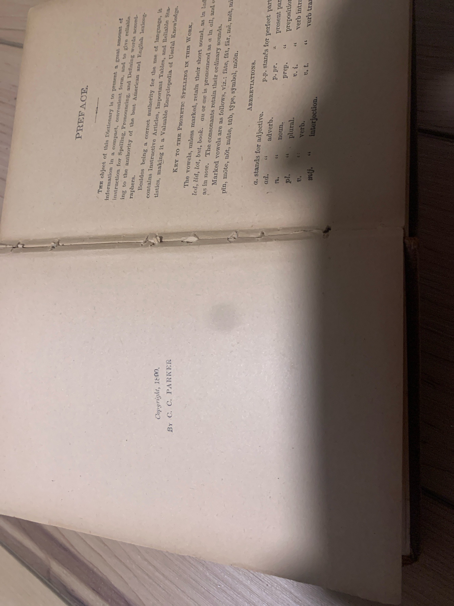 This is an antique printed book, specifically a dictionary or phonetic lexicon, showing the title/copyright page and preface. The text indicates it was copyrighted in 1890 by C. C. Parker. The paper is an off-white, cream-toned stock that shows significant age-related yellowing and foxing throughout. The binding is visible at the gutter, revealing a sewn structural composition with some deterioration and loosening of the threads and paper near the spine. The typography is characteristic of late 19th-century Victorian printing, using various serif fonts for headers and abbreviations. Notable sections include a 'Preface,' a 'Key to the Phonetic Spelling in this Work,' and a list of 'Abbreviations.' The visible exterior edge suggests a brown cloth or leather-wrapped hardbound cover. Condition issues include page tanning, edge wear, and potential structural weakness in the binding. There are some minor stains or smudges on the paper surface, likely from historical handling. The craftsmanship reflects mass-produced scholarly reference materials from the late 1800s, designed for utility and educational accessibility.