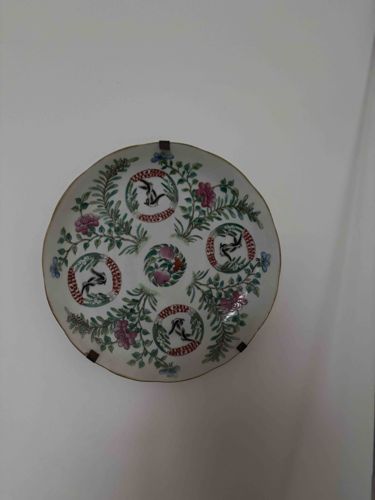 This is a circular porcelain plate featuring a shallow profile and a lobed or slightly scalloped rim. The item is decorated in the traditional 'Famille Rose' palette, characterized by soft pink, green, and iron-red overglaze enamels. The central motif consists of a floral medallion surrounded by four secondary circular reserves. Within these reserves are depictions of birds (possibly magpies or swallows) perched on flowering branches, bordered by a repeating red and white hatched pattern. Interspersed between the medallions are lush floral sprays, including peonies and green foliage, which are rendered with fine brushwork typical of 19th-century Chinese export porcelain. The background glaze is a cool white with a slight bluish-grey tint. Visible condition issues include some fading of the enamel on the central medallion and at the edges, consistent with age and surface wear. A three-point metal plate hanger is currently attached to the rim, which suggests it has been used as a wall display piece. This style of decorative porcelain was predominantly produced during the Qing Dynasty, likely in the Guangxu period (late 19th century), intended for both domestic use and the international export market. The craftsmanship shows high-quality hand-painting with careful attention to the symmetry and botanical accuracy of the floral elements.