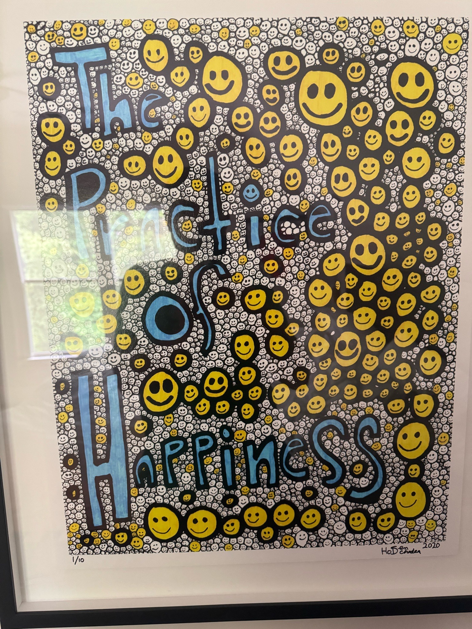 This is a contemporary limited edition art print titled 'The Practice of Happiness,' dated 2020. The composition features a dense, rhythmic pattern of smiley faces in varying sizes, primarily in yellow and white, all outlined in heavy black ink against a white background. The text 'The Practice of Happiness' is integrated into the design in a stylized, light blue hand-lettered font. The artwork is signed 'HoDe 2020' in the bottom right corner and numbered '1/10' in the bottom left, indicating it is the first print in a very small, exclusive run of ten. The medium appears to be a digital or giclée print on high-quality white paper. The craftsmanship showcases a pop-art influence with 'horror vacui' style detailing, where the entire surface is filled with imagery. The item is framed behind glass in a simple black frame with a wide white mat board. The condition appears excellent, with no visible fading, foxing, or moisture damage. The paper is crisp, the inks are vibrant, and the frame is well-maintained, suggesting it has been kept in a temperature-controlled environment away from direct sunlight.