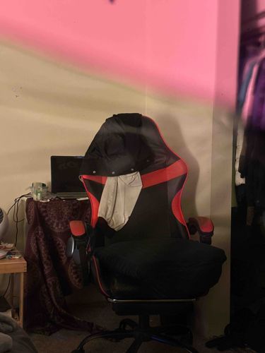 This is a racing-style ergonomic gaming chair, characterized by its high-back 'bucket seat' design intended for long periods of sitting. The chair features a dual-tone color scheme of matte black and vibrant red synthetic leather (likely polyurethane or PVC) upholstery. It includes a tall, contoured backrest with integrated shoulder support and fixed armrests that feature padded red tops. The base consists of a standard five-point star nylon swivel base with rolling casters. Notable physical characteristics include contrast stitching and curved silhouette lines. In its current state, the chair is partially obscured by clothing items draped over the backrest and an additional black fabric cushion or garment placed on the seat pan, suggesting a need for added comfort or protection of the original seat material. There are no visible manufacturer logos from this angle, but the design is typical of entry-level to mid-range gaming furniture from the late 2010s to early 2020s. Condition appears used with some sagging in the seat area and slight scuffing visible on the lower base and casters. The overall craftsmanship is functional, utilizing staple-gun assembly for the upholstery and bolt-on components for the frame and armrests.