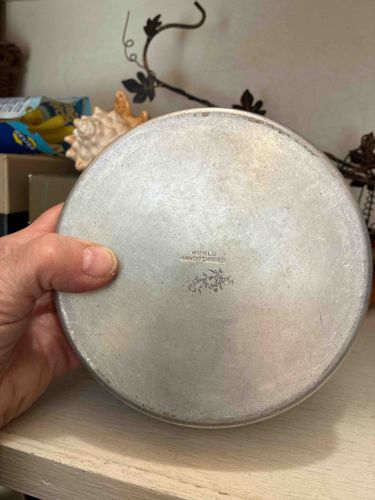 This item is a circular dish or plate crafted from hammered aluminum, a style that reached peak popularity in the mid-20th century. Physically, the item exhibits a matte, silvery-grey finish characteristic of aged aluminum. The piece is constructed from a single sheet of metal, likely formed using hand-forging techniques as suggested by the stamped marking. In the center of the underside, there is a clear manufacturer's mark that reads "WORLD HAND FORGED" accompanied by a decorative floral or leaf-like logo. The surface shows a distinct texture known as a hammered finish, intended to give it an artisanal, handcrafted appearance. In terms of condition, the plate displays age-appropriate wear including fine surface scratches, some localized oxidation, and a developed patina that has dulled the original luster. There are no major dents or structural failures visible in the current view. This style of metalwork was commonly produced in the 1930s through the 1950s by various American companies, including World Hand Forged, which specialized in giftware and holloware that emulated more expensive silver pieces. The craftsmanship is solid, representing a durable example of mid-century domestic metalware.