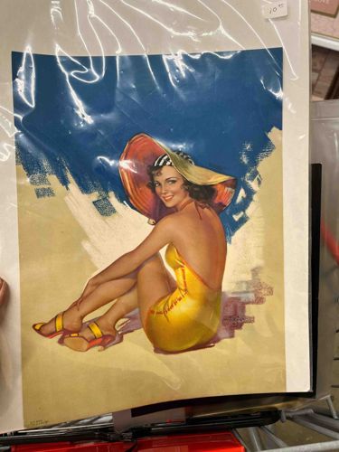 This is a vintage-style lithographic art print of a pin-up illustration by the renowned artist Zoe Mozert, originally created for mid-20th-century calendars or advertising. The artwork features a woman in a backless yellow swimsuit and a wide-brimmed sun hat, seated against a painterly blue and beige background. The print displays the characteristic soft-focus, idealized aesthetic of the 1940s and 1950s pin-up era. It appears to be printed on medium-weight paper stock and is currently enclosed in a protective plastic sleeve with a price tag of '$10.00' visible in the upper right. The color palette is dominated by vibrant yellows, deep blues, and warm skin tones. One notable feature is the artist's signature, visible in the lower-left corner as 'Zoe Mozert'. Regarding condition, the paper shows some slight yellowing consistent with age, and there appear to be minor ripples in the paper surface, though these may be reflections from the plastic sleeve. The illustration quality is high, showcasing the smooth gradients and anatomical precision that Mozert was famous for as one of the few prominent female pin-up artists of her time. The item likely dates from the mid-century period or is a high-quality later reproduction intended for the collectors' market.