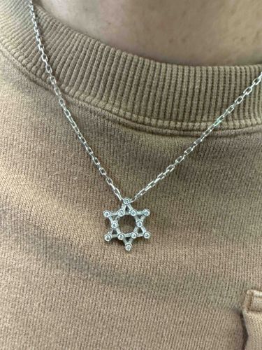 This fine jewelry piece consists of a Star of David (Magen David) pendant suspended from a dainty cable-link chain. The pendant is crafted in a cool-toned metal, likely 14k or 18k white gold or platinum, featuring a modern openwork design. The hexagram is composed of twelve small, circular bezel settings, each securely holding a small round brilliant-cut stone. These stones appear to be diamonds or high-quality cubic zirconia, exhibiting significant sparkle. The construction is delicate yet industrial, with small bar-style connectors linking the round bezels together to form the iconic six-pointed star. The chain is a classic anchor or cable style with uniform oval links and appears to be integrated through the top point of the star rather than a separate bail, providing a seamless look. In terms of condition, the piece shows minimal wear, with no visible tarnish or missing stones, suggesting a contemporary manufacture date. The craftsmanship reflects a clean, minimalist aesthetic popular in late 20th to early 21st-century jewelry design. The lack of visible oxidation suggests a high-quality precious metal alloy. This item serves both as a religious symbol and a sophisticated piece of personal adornment.