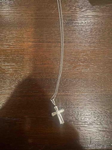 This jewelry piece consists of a sterling silver cross pendant suspended from a fine curb link chain. The pendant features a contemporary architectural design, utilizing five clear, baguette-cut stones—likely cubic zirconia or glass—arranged to form a Latin cross. The stones are secured in a channel or heavy prong setting, creating a sleek, shimmering effect across the surface. The central stone is vertically oriented, flanked by two horizontal baguette stones forming the arms, with longer vertical stones completing the top and bottom sections. The metal is bright and polished, exhibiting the characteristic high-luster white finish of .925 sterling silver. The chain appears to be a lightweight, machine-made curb or cable style, attached to the pendant via a tapered polished bail. Condition-wise, the item shows minor surface scratches and light tarnish consistent with occasional wear. The stones appear intact without significant chipping, though minor dirt accumulation is visible around the settings. This style is consistent with late 20th or early 21st-century fashion jewelry, emphasizing clean lines and modern craftsmanship. The overall quality reflects standard commercial jewelry production, providing a balanced aesthetic of religious symbolism and modern elegance.
