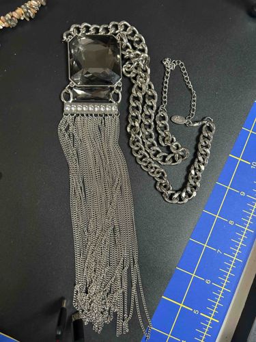 This Juicy couture necklace weighs in at 199grams it is 22 inches long the tassels measure 9 1/2 inches and the large center stone measures one and three-quarter inch by one and three-quarter inch the makers mark is oval shaped. It looks like a series of circles on the front and on the back it is a bunch of horizontal lines equal distant apart has a very nice lobster clasp