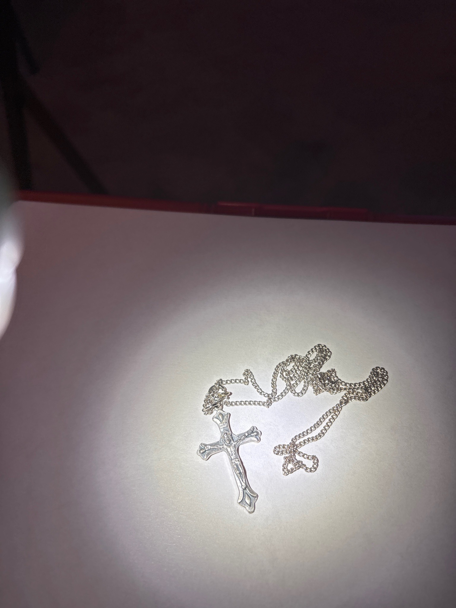 This item is a traditional Catholic crucifix pendant suspended from a fine curb link chain, both appearing to be crafted from sterling silver or a similar silver-toned metal. The pendant features a detailed figure of the Corpus (body of Christ) in relief against a flared, budded-style cross. A prominent 'INRI' plaque is visible at the top of the cross beam. The cross ends have a distinctive trefoil or scalloped shape, adding an ornamental touch to the design. The metal displays a bright, reflective finish with subtle natural patina or oxidation in the recessed areas of the sculpture, which enhances the detail of the casting. The chain is a delicate curb style with flat, interlocking links that show uniform craftsmanship. Regarding condition, the piece appears well-maintained with no visible breaks in the chain links or severe distortions to the pendant, though minor surface scratches consistent with use may be present. While specific maker's marks are not clearly legible from this distance, the style is characteristic of late 20th-century religious jewelry. The quality of the casting on the Corpus suggests a mass-produced but high-quality devotional piece intended for personal wear.