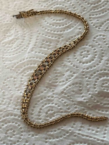 This is a sophisticated tri-color metal link bracelet, likely crafted in 14k or 18k yellow, white, and rose gold. The piece features a complex woven construction reminiscent of a panther or brick-link style, consisting of five staggered rows of polished rectangular links. The central three rows showcase alternating bands of white and rose gold, bordered by outer bands of yellow gold with rounded 'gaspipe' or beaded edges. The bracelet measures approximately 7 to 7.5 inches in length and features a substantial integrated box clasp with a safety fold-over latch for secure wear. Its aesthetic is characteristic of high-quality jewelry from the late 20th century, specifically the 1980s or 1990s, when multi-tone gold designs were highly favored. The craftsmanship is evident in the fluidity of the links and the precision of the interlocking metalwork. The item appears to be in excellent vintage condition with a light surface patina and no visible breaks, missing links, or significant abrasions. While specific maker's marks are not visible in the provided image, they would typically be located on the tongue or underside of the clasp assembly.