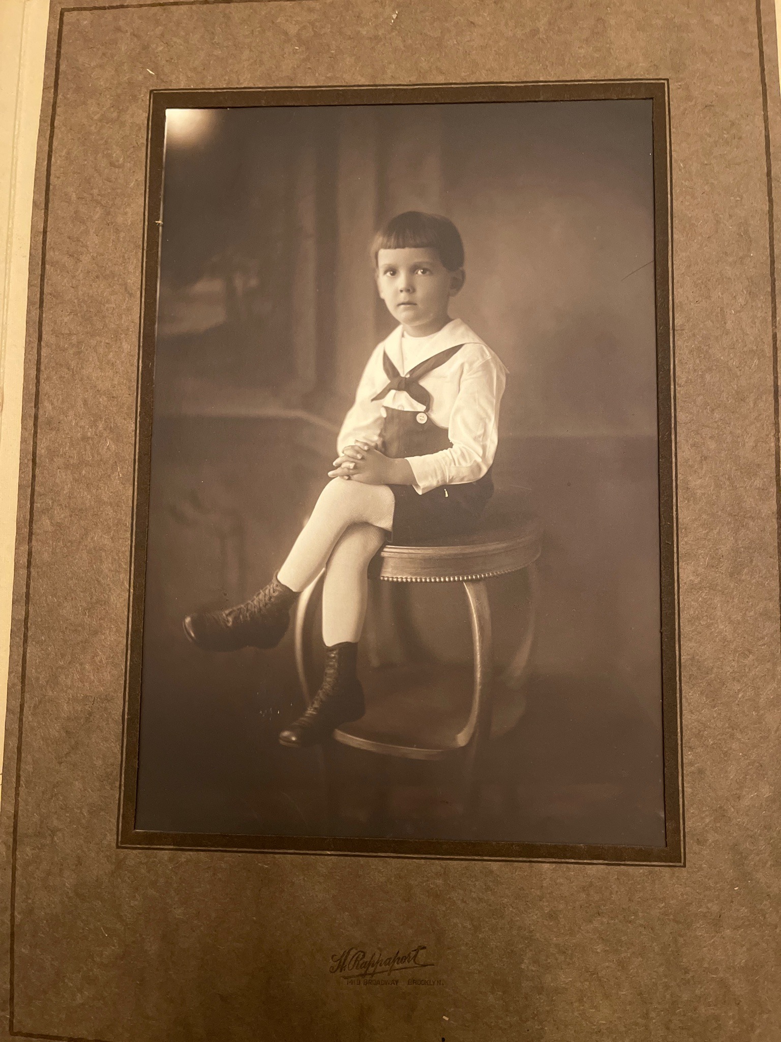 This is an original black-and-white studio portrait from the early 20th century, likely dating between 1910 and 1920. The photograph depicts a young boy seated on a circular, ornate wooden stool against a soft, hand-painted theatrical backdrop. The subject is dressed in a classic sailor-style outfit, featuring a white long-sleeved shirt with a wide collar and a dark necktie, paired with dark shorts or knickers, white stockings, and dark leather lace-up boots. The child's pose is formal, with hands folded and legs crossed, which was typical for high-end studio photography of the era. The print itself exhibits a subtle sepia tint and is mounted within a heavy, textured grey cardboard folder or matting. A notable maker's mark is embossed in gold or dark ink at the bottom center of the mount, reading 'H. Rappaport, 1149 Broadway, Brooklyn, N.Y.', which identifies the specific studio and location of production. The condition appears excellent for its age, showing minimal silvering or fading. The matting shows minor shelf wear and light paper oxidation, but the image clarity remains sharp with good tonal range, indicating professional-grade processing. The quality of the lighting and the sophisticated composition are characteristic of professional Brooklyn photography studios of the Edwardian era.